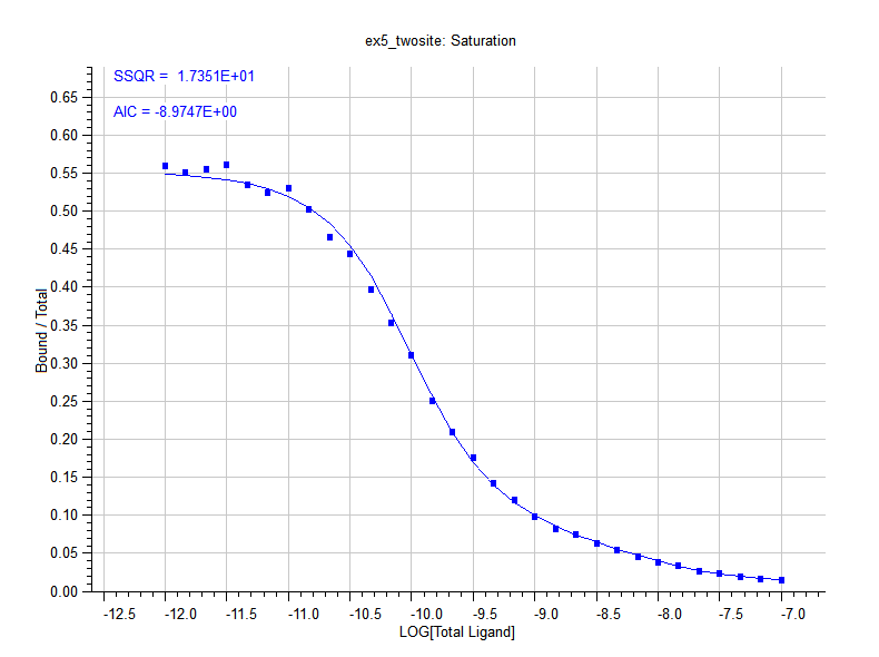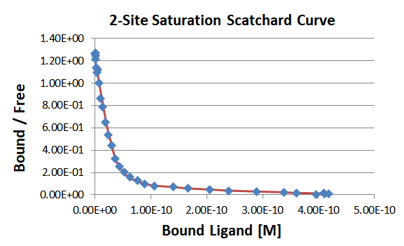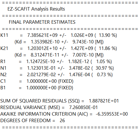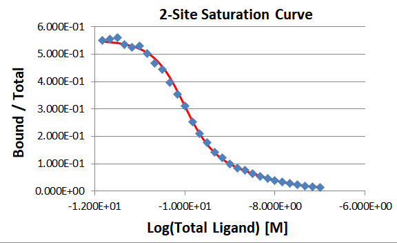 EZ-SCAFIT performs the non-linear least square curve fit of experimental receptor binding data using estimates of KA, Rmax and Nonspecific. The Bound ligand vs Total ligand coordinate system is used in the analysis of one or two binding sites for saturation or competition assays.