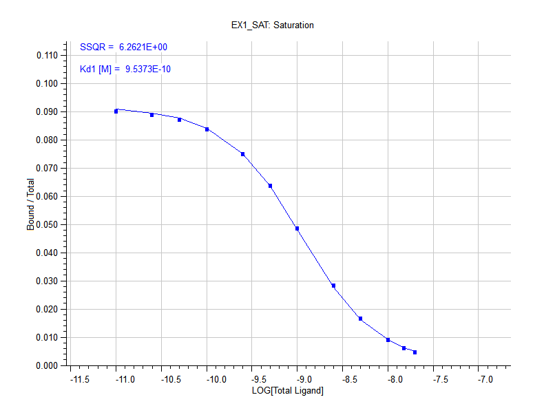 EZ-SCAFIT performs the non-linear least square curve fit of experimental receptor binding data using estimates of KA, Rmax and Nonspecific. The Bound ligand vs Total ligand coordinate system is used in the analysis of one or two binding sites for saturation or competition assays.